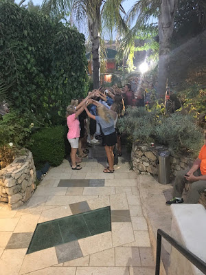 And now to our final meal together in Israel. We had a brief window of time to return to our hotel and shower before our trek home began. In a frenetic pace we divided boys and girls into single rooms, showered, packed and readied ourselves for the journey to our last meal at the table as a group and our flight home. Dinner was at a small restaurant off the beaten path, a hidden gem if you will. We even drove on the Road to Emmaeus and landed in Abu Gash, the very place that Samson would have been "hanging out", so many centuries ago. The tables were covered with platters of delicious food, local to the region and we devoured each and every bite, all while we laughed and shared a special memory of our time together with the entire group. I'm not much for speaking in front of large groups but this act of remembering and celebrating and sharing marked me. I relished this time hearing out loud what was significant about this time from everyone, including our tour guide, Aaron and our trip leaders. The students had been preparing a song for our extraordinary tour guide and bus driver and so when dinner was over, photos were taken and goodbyes exchanged they made a tunnel and sent Aaron and his family as well as Elie our bus driver off with fan fare, in the very best way! This group knows how to celebrate well! And from there it was karaoke on the bus all the way to the airport and laughter that filled the bus. Never, ever a dull moment.